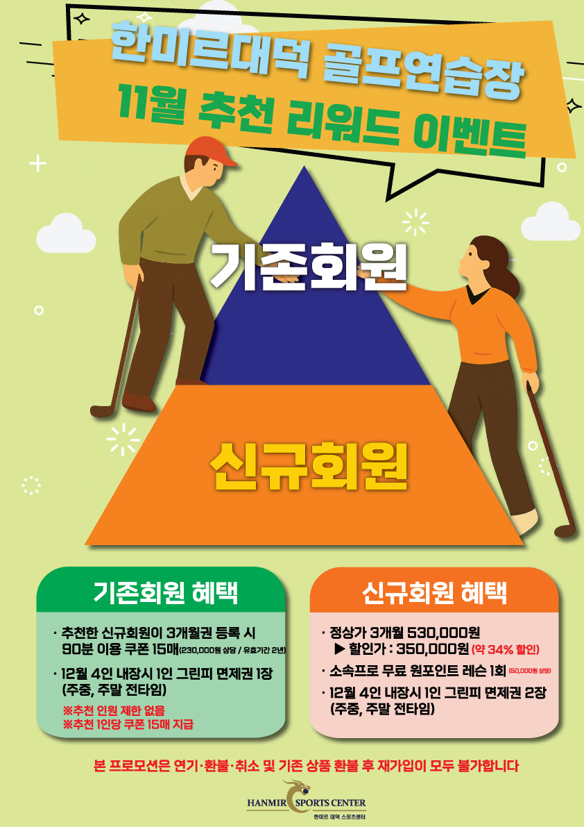 혹한기 전에 준비하는 가장 큰 혜택! 11월에만 만날 수 있는 특별 할인과 풍성한 보너스를 놓치지 마세요. 이벤트 기간 2025.11.14 ~ 2025.11.30 기존회원 추천 혜택 추천한 신규회원이 3개월 등록 시 90분 이용 쿠폰 15매 증정 (230,000원 상당 ) 신규회원 혜택 정상가 3개월 530,000원 → 350,000원 무려 180,000원 할인!